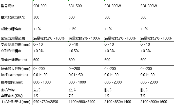 主機為四立柱或雙立柱剛性框架,有立式和臥式兩種機型,絲杠調節拉頭移動,加載速度無級設定。